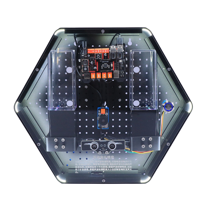 Интерактивный модуль для оформления зон рекреации, кабинетов, IT-полигона, библиотеки, медиа зоны. Модуль демонстрирует аудиовизуальные эффекты, управляя комбинацией потока воды, света и музыки. Его принципы и технологии включают управление музыкой, управление потоком воды, управление освещением и интерактивные технологии. Модуль выполнен в форме шестиугольной призмы с интерактивным наполнением.