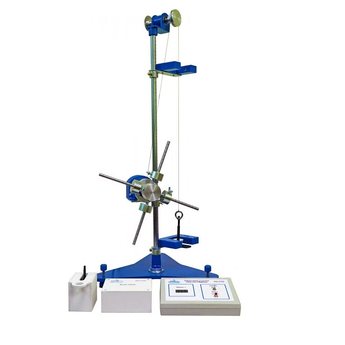 Учебная лабораторная установка смонтирована на вертикальном металлическом настольном стенде. Вертикальная поверхность учебного стенда изготовлена из стали и имеет порошковое покрытие. На ней размещен шкив, который свободно вращается на горизонтальной оси и имеет барабан для наматывания нити, четыре радиальные спицы, по которым перемещаются грузы, а также диск с 20 секторами. Шкив смонтирован в верхней части стенда. Вплотную к нему установлен цифровой датчик угловой скорости, в прорезь которого заходит диск с секторами.