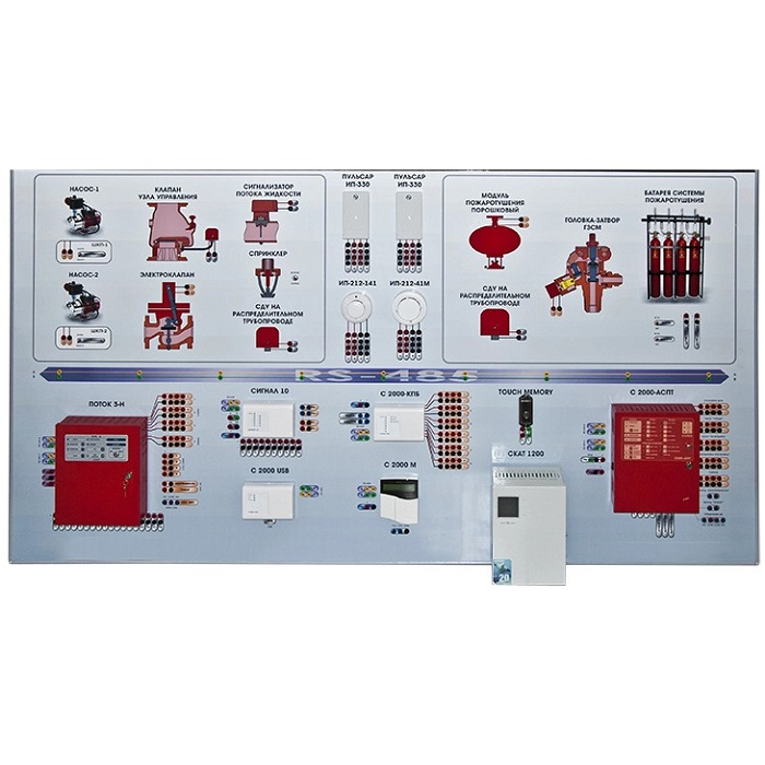 Интерактивный демонстрационно-тренажерный стенд "Системы автоматического пожаротушения" предназначен для изучения принципов монтажа и соединения компонентов, автоматических охранно-пожарных систем на базе различных (по желанию заказчика) приемно-контрольных приборов, а также их работы в составе автоматической противопожарной защиты.